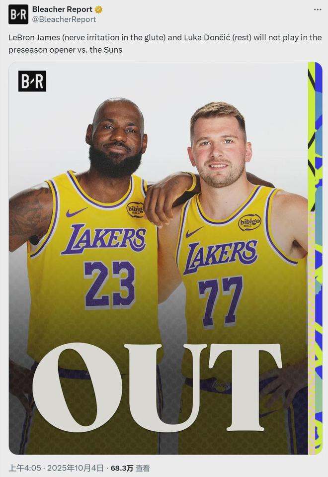 北京時(shí)間10月4日,NBA季前賽:湖人vs太陽(yáng),這是美國(guó)本土季前賽的揭幕戰(zhàn)。昨天兩場(chǎng)季前賽,都是在海外進(jìn)行的(阿聯(lián)酋和澳大利亞)。距離比賽開打僅剩6個(gè)多小時(shí),湖人官方宣布:東契奇退出對(duì)陣太陽(yáng)和勇士的兩場(chǎng)季前賽。