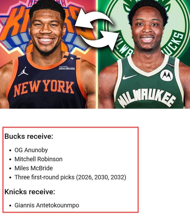 另一方面,關(guān)于字母哥的潛在交易方案已浮出水面。美媒近期曬出尼克斯與雄鹿的1換6交易構(gòu)想:尼克斯送出阿奴諾比、米切爾-羅賓遜、麥克布萊德三位即戰(zhàn)力球員,外加三個(gè)首輪簽,從雄鹿換來字母哥。從籌碼價(jià)值來看,阿奴諾比是聯(lián)盟頂級(jí)的3D側(cè)翼,米切爾-羅賓遜能補(bǔ)強(qiáng)內(nèi)線防守,三個(gè)首輪簽則能為雄鹿未來重建提供關(guān)鍵資產(chǎn),這樣的報(bào)價(jià)對(duì)已瀕臨“重建邊緣”的雄鹿而言,無疑是極具吸引力的選擇。而對(duì)尼克斯來說,得到字母哥后,將能組建起“字母哥+現(xiàn)有核心”的爭冠陣容,進(jìn)一步鞏固?hào)|部頂級(jí)強(qiáng)隊(duì)的地位。