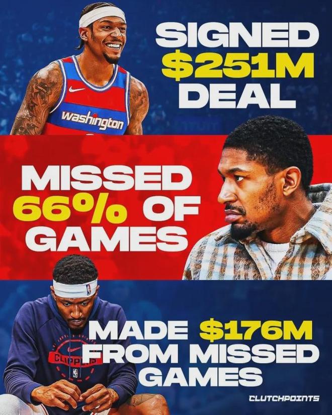 話說比爾夠爽的,據(jù)統(tǒng)計自簽下五年2.51億美元頂薪合同之后,缺席了66%的比賽,躺賺1.76億美元,堪稱摸魚打工人的典范&資本家的超級噩夢。